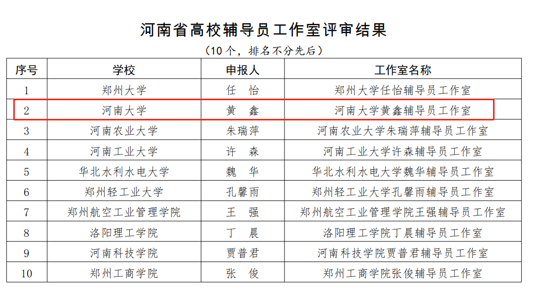 近日,河南省委教育工委、河南省教育厅公布《关于河南省高校辅导员工作室评审结果的公示》,我校党委学生工作部组织申报的“米兰平台黄鑫辅导员工作室”榜上有名。此次评选活动自今年7月启动,经各高校申报、资格审查、专家评审、综合评议等环节,评选出10个河南省高校辅导员工作室。