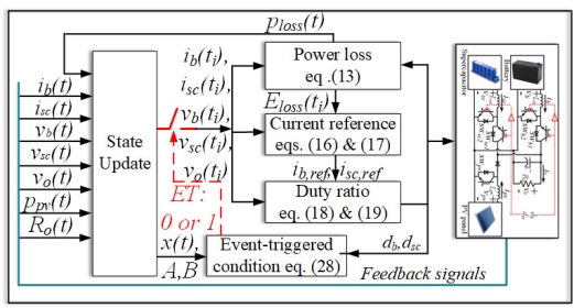 该论文提出了一种简洁的无差拍控制策略,使混合储能系统能够在光伏发电量和负荷需求快速变化的情况下,实时高效地稳定输出电压。在系统建模中考虑了半导体器件的导通损耗,通过补偿导通功率损耗,提升了系统的动态性能。同时,与事件触发控制相结合,减少开关损耗和计算量。通过综合评测实验表明,系统动态误差和安定时间分别降低25.6%-36%和33.3%-37.5%,在事件触发机制的控制下,开关损耗和计算负担降低30%-41.9%。该方法有效地解决了由于可再生能源不确定性所导致的用电安全问题。