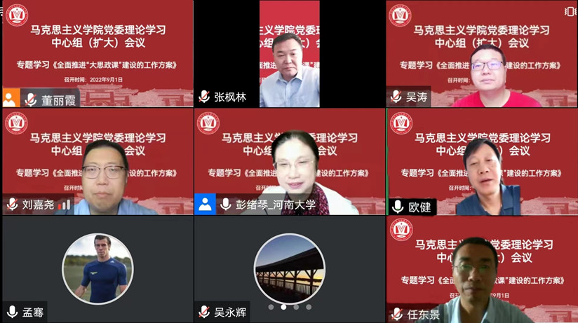 9月1日上午,马克思主义学院在线上召开党委理论学习中心组扩大会议,专题学习教育部等十部门印发的《全面推进“大思政课”建设的工作方案》(以下简称“工作方案”),学院全体党委委员、领导班子成员,各系、室主任,全体行政人员参加会议,会议由学院党委书记彭绪琴主持。