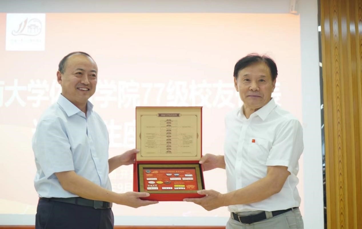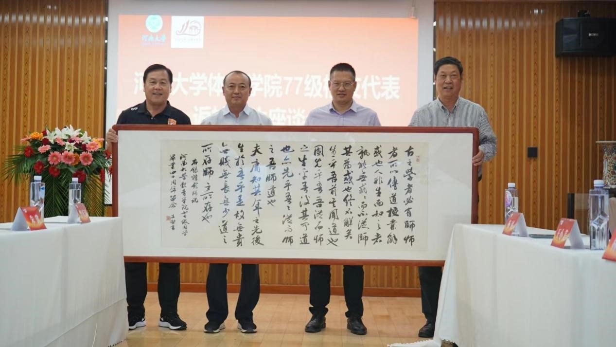 校友河南省体育局原副局长张跃敏、开封市教育体育局原副局长杨钊代表77级校友向体育学院赠送书法作品《师说》,感念师生情。校友郑州大学体育学院(校本部)原院长林克明、河南财经政法大学体育学院原院长崔伟和信阳师范学院体育学院原院长王小美向老教师们献上鲜花并赠送印有专门LOGO的纪念衫、纪念背包。段廷良代表体育学院向77级校友代表赠送米兰平台110周年校庆专属纪念品徽章。
